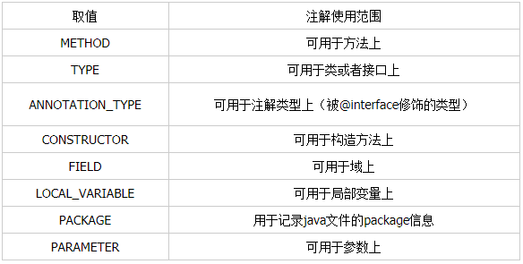 4、@Target({TYPE, METHOD, FIELD, PARAMETER}):表示含有此注解的注解使用范围。